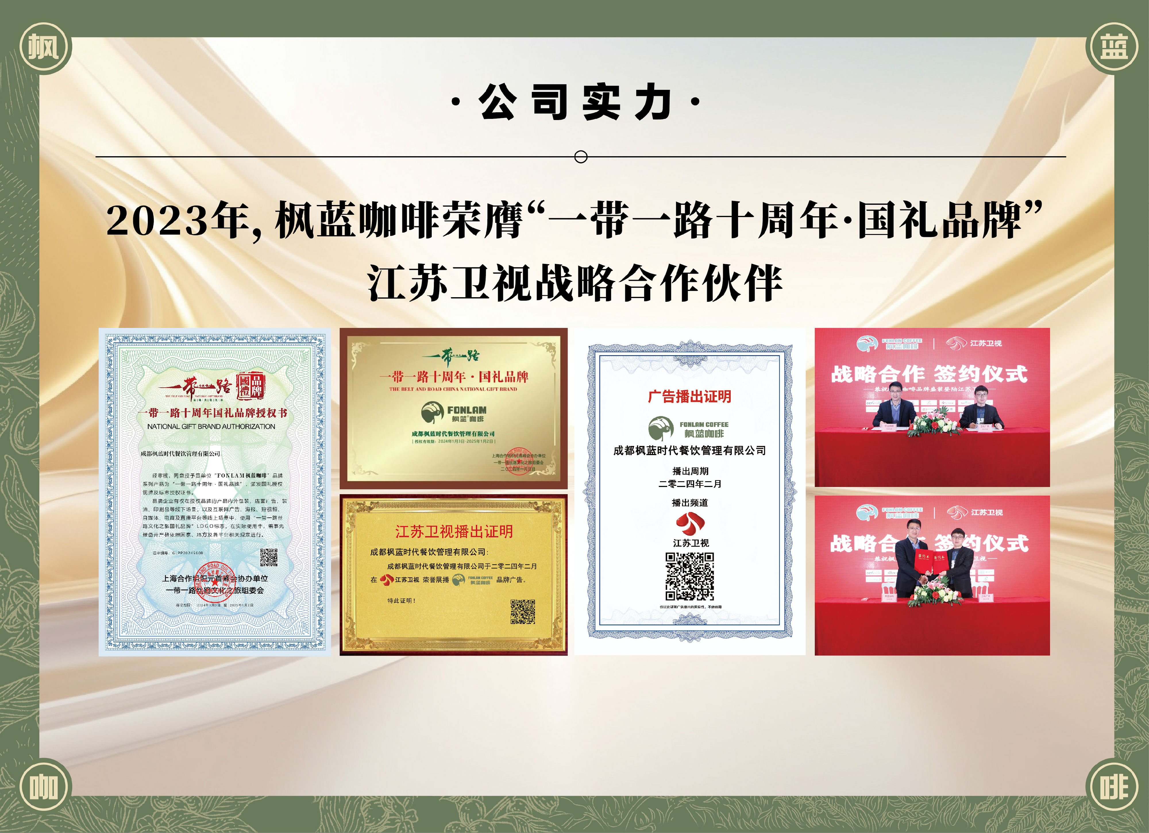 2023年底枫蓝咖啡在众多参选品牌中脱颖而出,荣膺“一带一路十周年·国礼品牌”。同年与江苏卫视达成战略合作,将枫蓝咖啡的形象搬上电视大荧屏。